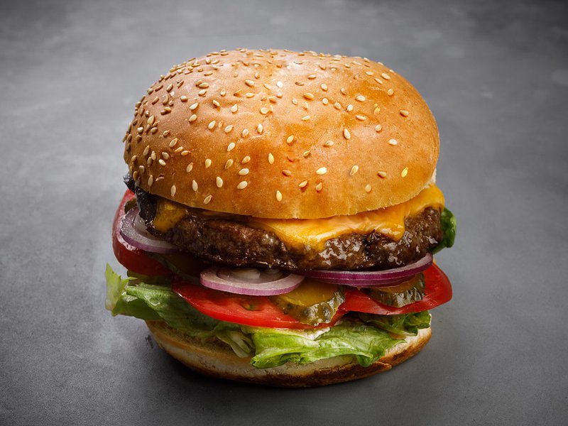 Говяжья котлета, айсберг, помидор свежий, огурец маринованный, сыр "Чеддар", луковые хлопья, лук крымский, соус фирменный