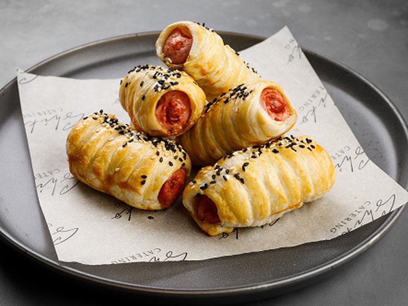 Детская куриная диетическая сосиска, слоеное тесто, черный и белый кунжут