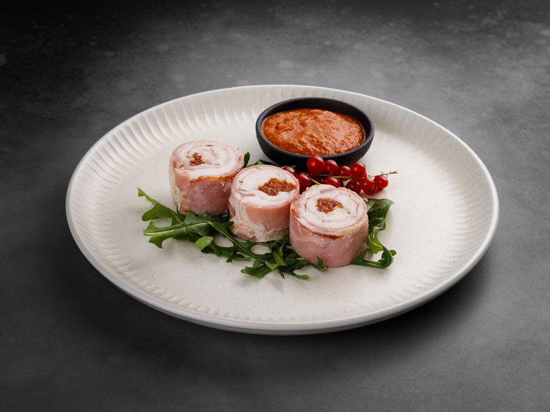 Рулетики из филе грудки индейки с вялеными томатами, запеченные до хрустящей корочки в беконе