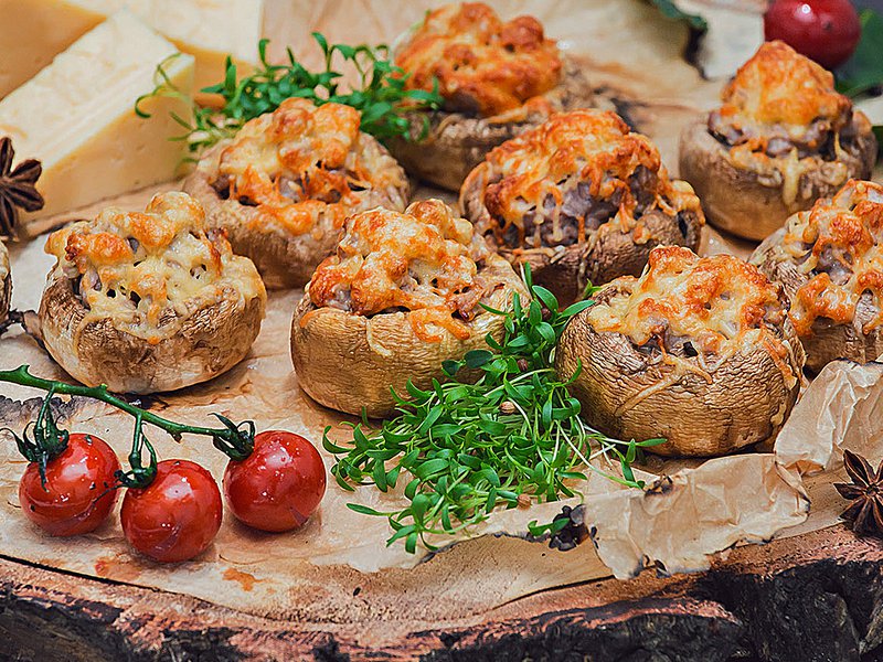 Шапки шампиньонов с мясной начинкой, запеченные под сырной шапкой