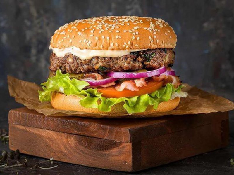 Булочка с кунжутом, котлета из мраморной говядины, салатный лист, сыр Чеддар, крымский лук, маринованый огурчик, свежие томаты, соус, подается с картофелем-фри и томатным соусом