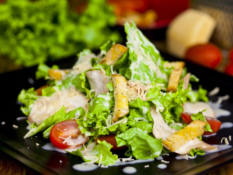 Микс листьев салата, томаты, мясо птицы, сыр, хлеб пшеничный