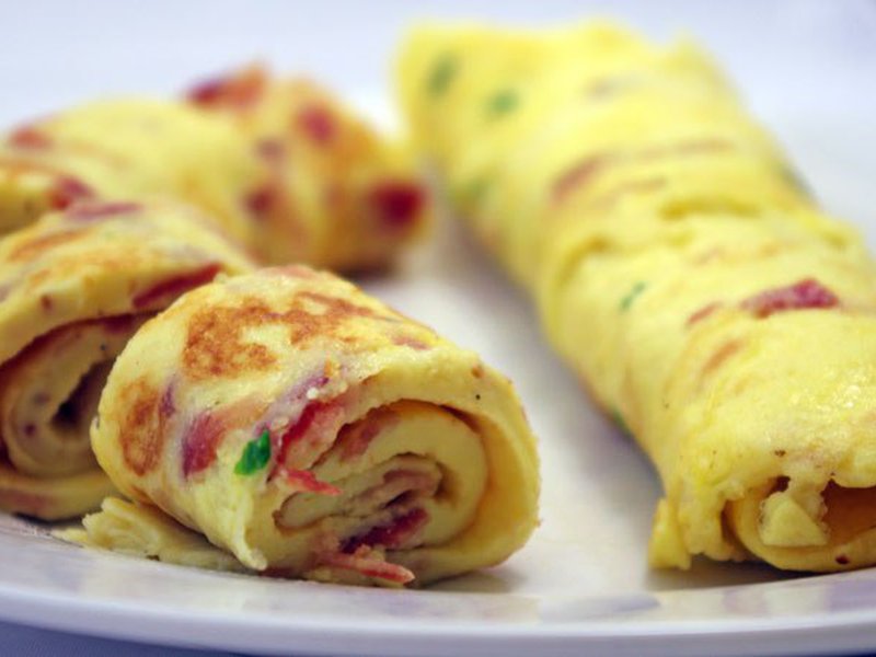 Рулеты из омлета с сыром и болгарским перцем, подается с тостами