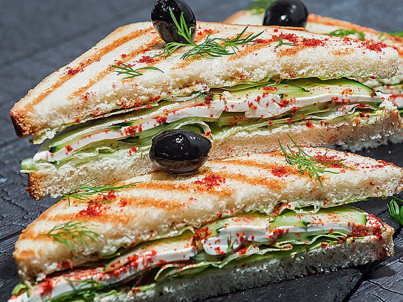 Обжаренные пшеничные тосты, сыр Фета, свежий огурец, салатный лист, соус Песто, паприка сладкая