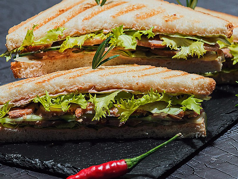 Обжаренные пшеничные тосты с ломтиками домашней буженины, маринованным огурчиком, томатами, салатным листом и горчичным соусом