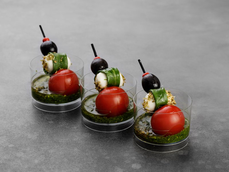 Помидорки «Черри», мини-сыр «Моцарелла» с маслинкой и соусом «Песто»