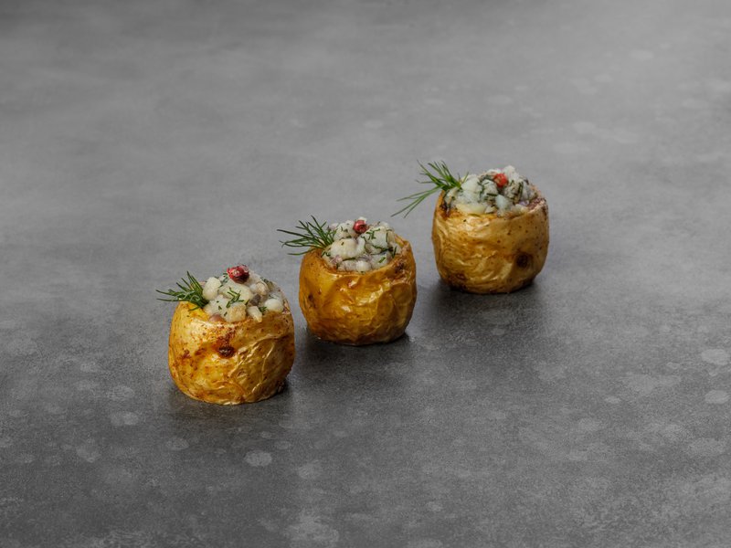 Печеный бэйби-картофель с ломтиками пряной сельди и розовым перцем