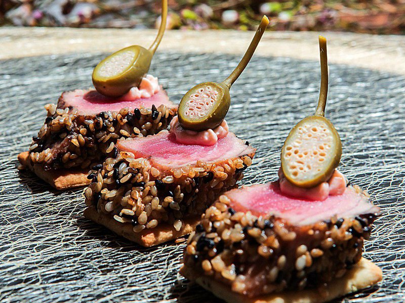 Обжаренный в кунжуте розовый тунец с королевским каперсом на хрустящем хлебце