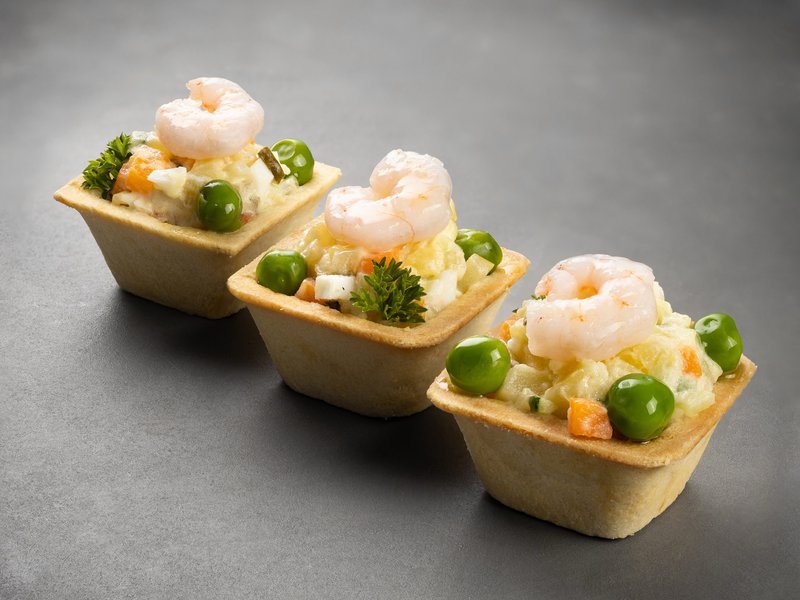 Тарталетка с салатом «Оливье» с коктейльными креветками (от 10 штук)