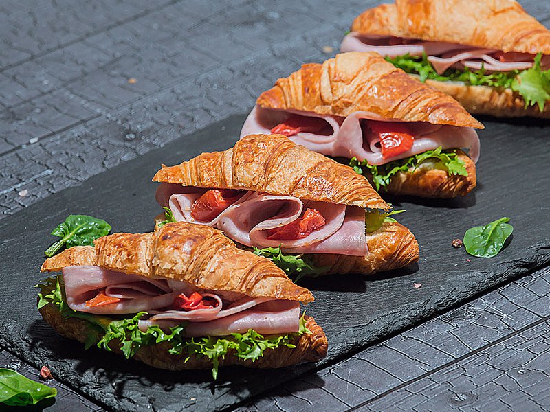 Хрустящий французский круассан с ветчиной индейки, подвялеными томатами, сливочно-творожным сыром и салатным листом