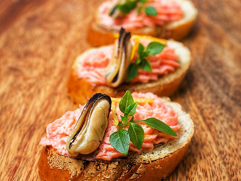 Мини-брускетта с муссом из лосося и мидиями (от 10 штук)