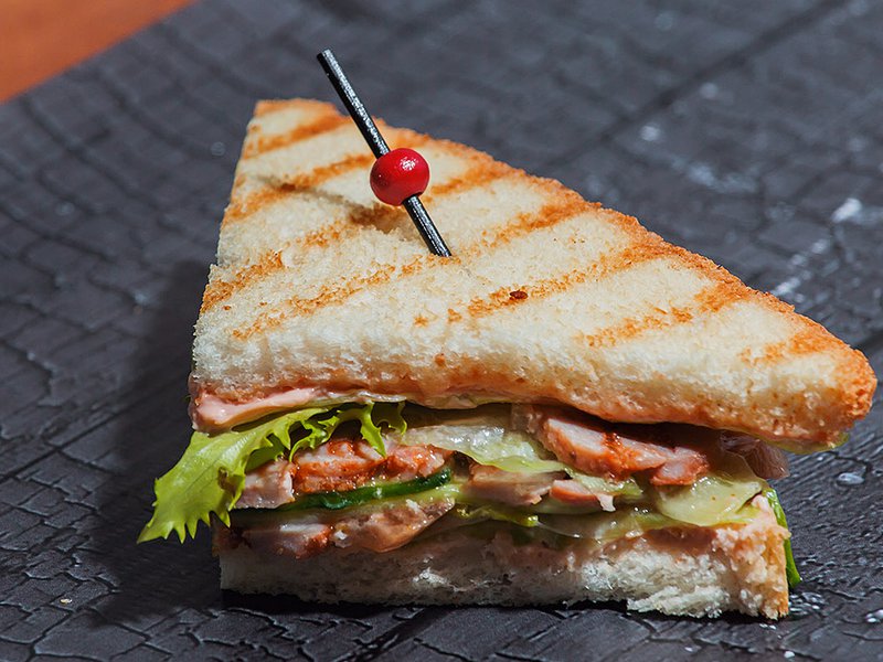 Обжаренные пшеничные тосты с ломтиками домашней буженины, маринованным огурчиком, томатами, салатным листом и горчичным соусом