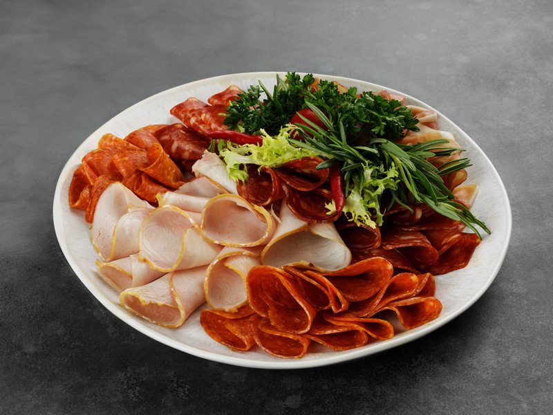 Тонко нарезанные карбонад, хамон, разнообразная нарезка в украшении зелени и королевских каперсов
