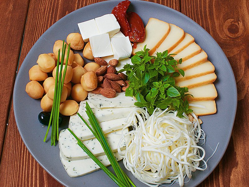 Домашняя брынза, Сулугуни, Чечил, Адыгейский с вялеными томатами, орешками и обжаренным миндалем