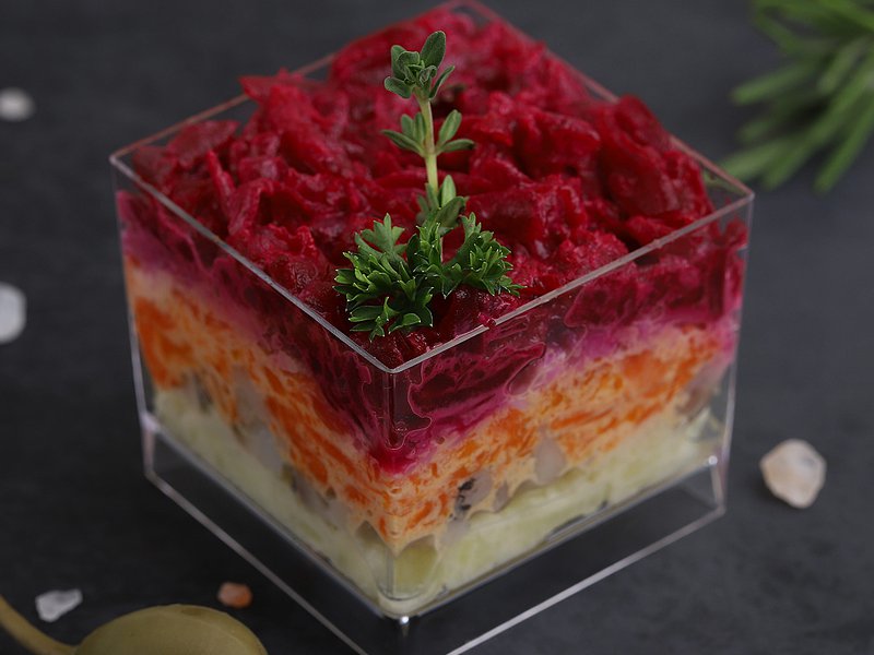 Сельдь атлантическая, свекла, яйцо, морковь, картофель, майонез, лук репчатый, зелень