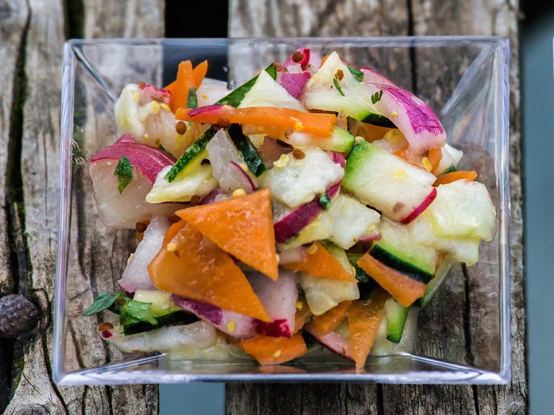 Салат из кабачков, редиса, морковки, красного лука, мяты и кинзы с французской заправкой