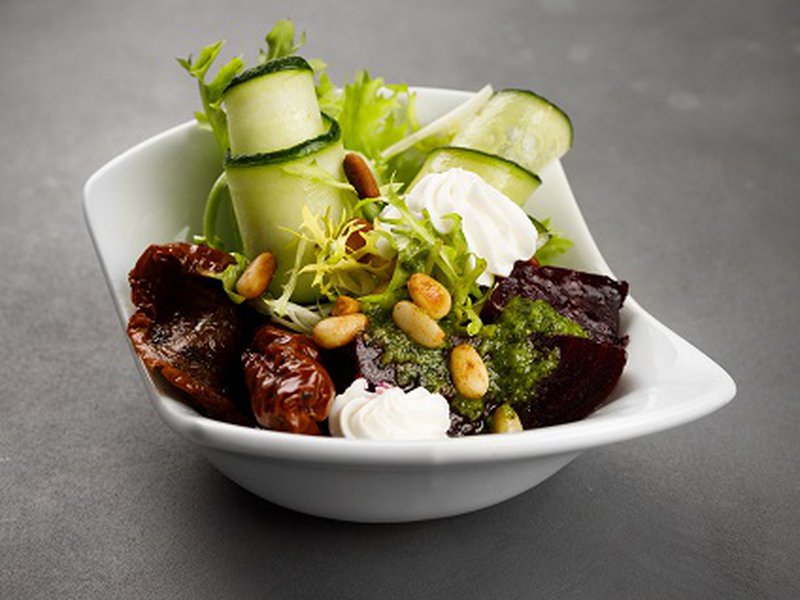 Салат из печёной свеклы с сыром Шавру, вялеными томатами и кедровым орехом (от 12 штук)