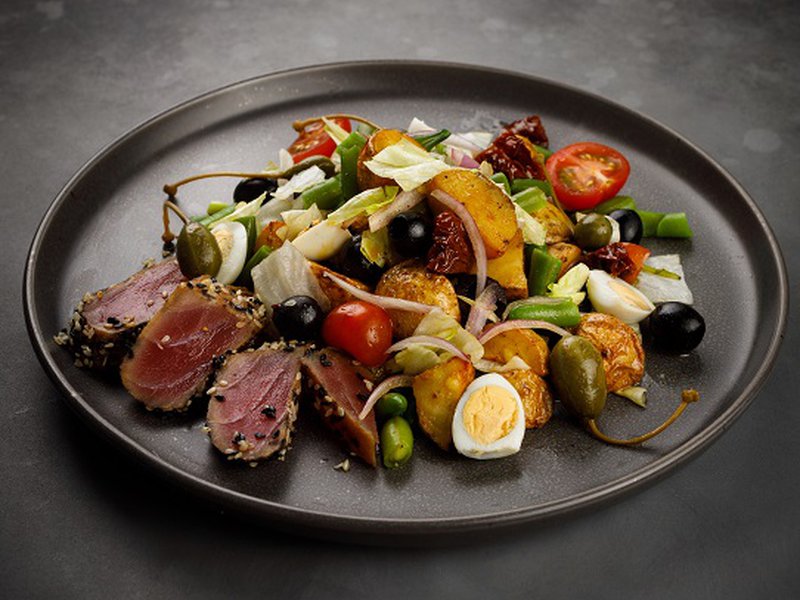 Микс салата, обжаренный картофель бейби, томаты Черри, спаржевая фасоль, розовый тунец, перепелиное яйцо, оливковый дрессинг, лайм