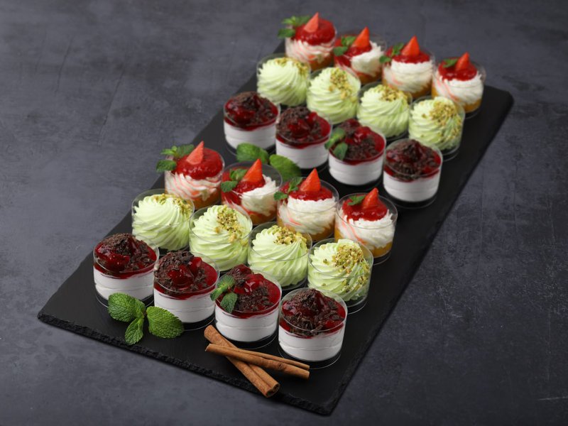 Ассорти десертов в мини-стаканчиках №4 (24 шт), Вишневое парфе, фисташковый мусс, "Ниагара"