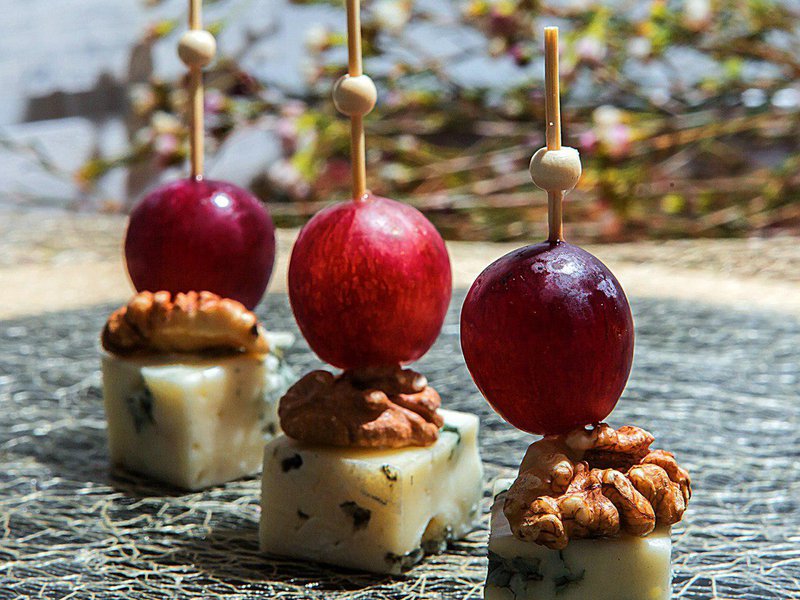 Кусочки сыра Дор-блю с грецким орехом и спелым виноградом