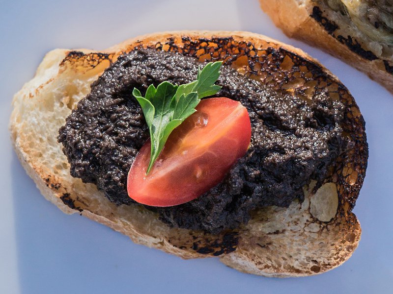 Обжаренная мини-брускетта с соусом Тапенада из маслин с оливковым маслом и травами, украшенная помидоркой Черри