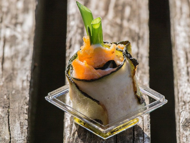 Тонкие ломтики цукини с кусочками печеной тыквы и пикантным соусом на основе постного майонеза