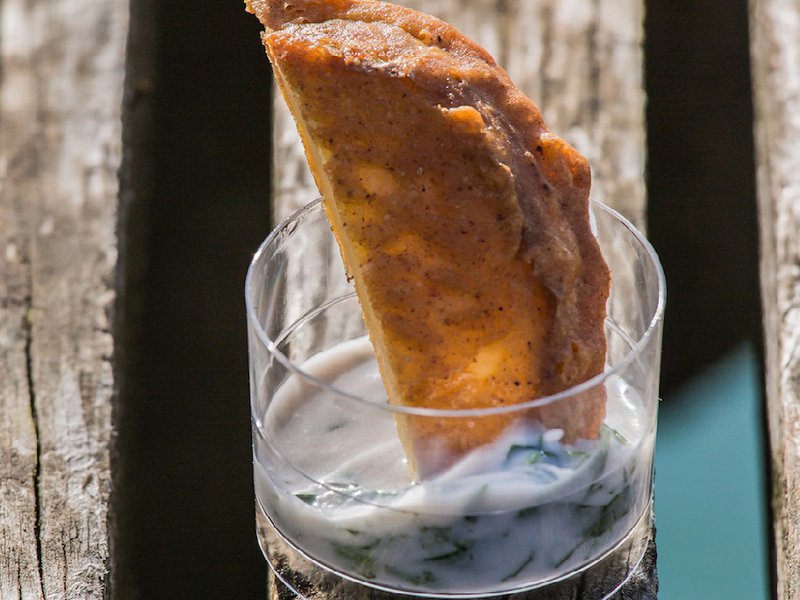 Ломтики картофеля в нутовом кляре с соусом из постного майонеза с мятой