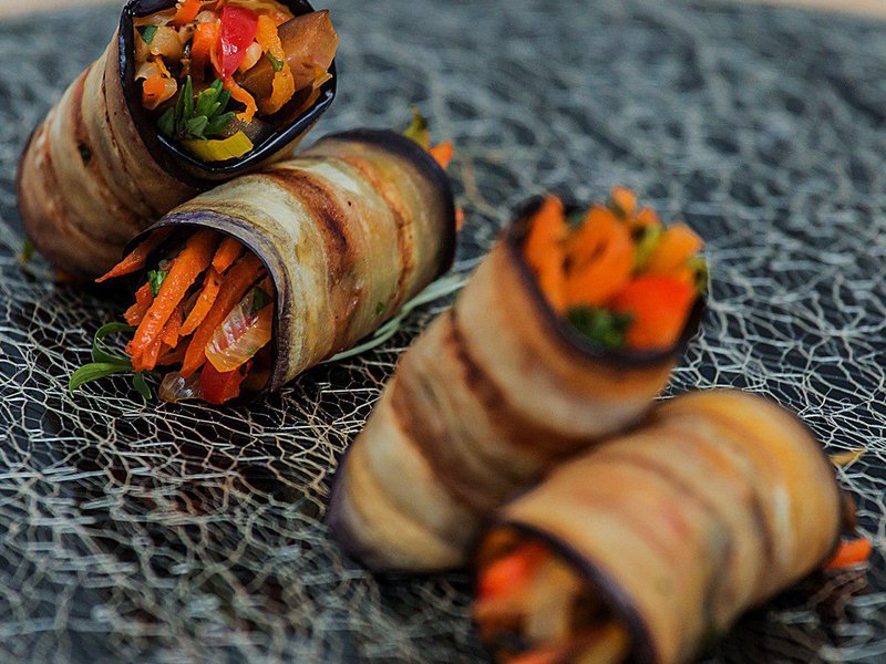 Рулетики из баклажан, обжаренные на гриле, фаршированные овощным жульеном с зеленью