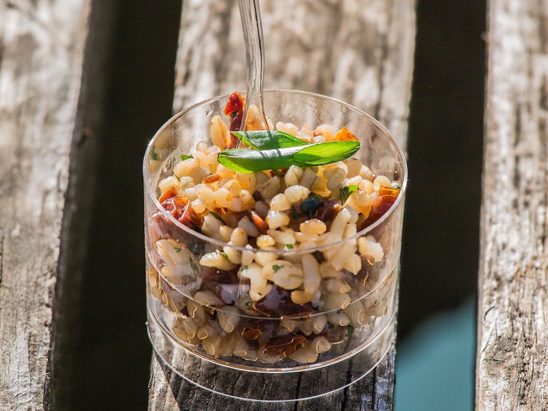 Салат из булгура с ломтиками цукини, вялеными томатами, оливковым маслом и зеленью